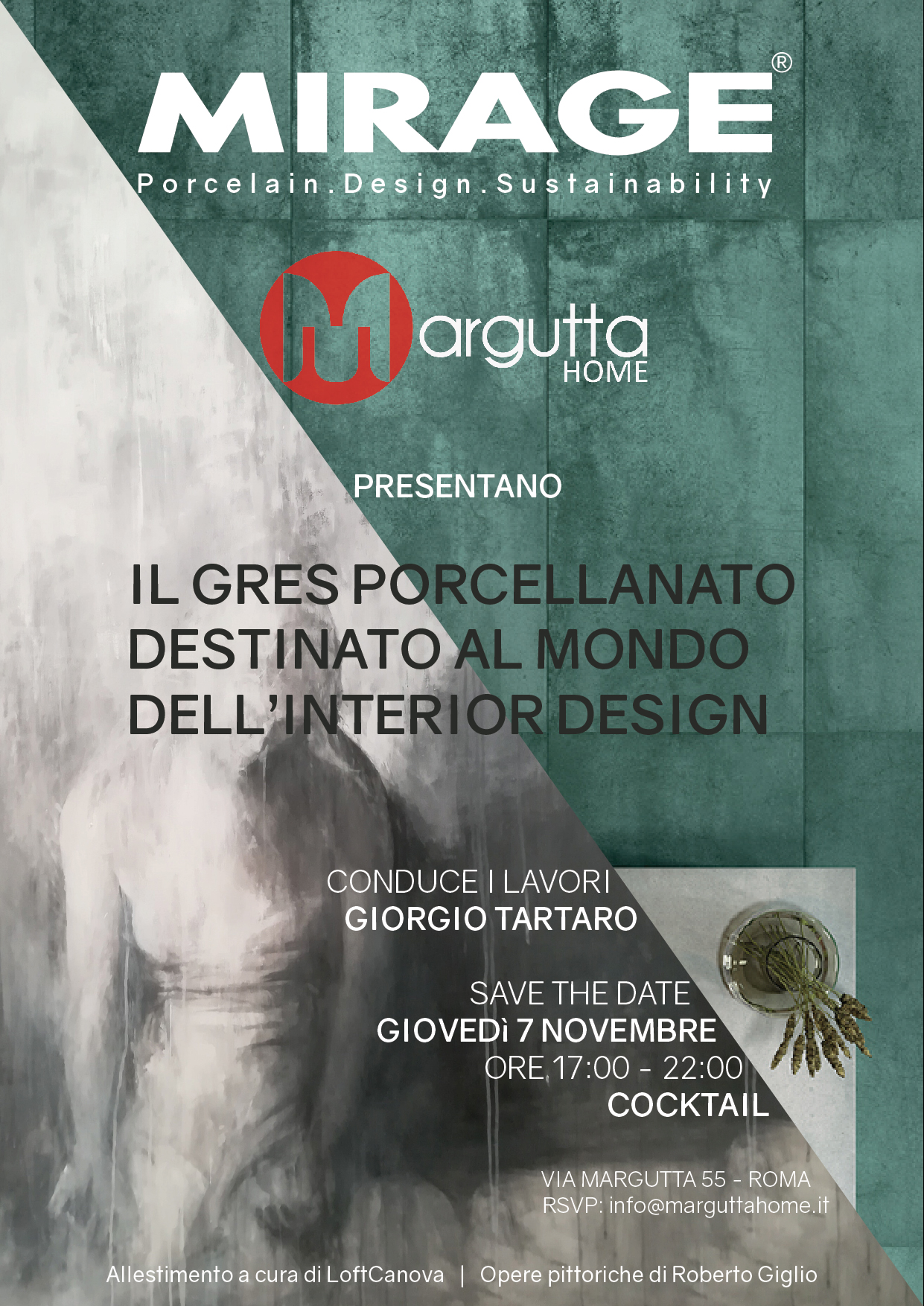 Mirage, azienda leader da più di 40 anni nel settore del Gres Porcellanato, arriva a Roma nella Design Boutique di Via Margutta 55, “Margutta Home”. Giovedì 7 novembre alle ore 17.00 abbiamo inaugurato l’esposizione con un evento dedicato ai grandi formati e alle ultime novità presentate al Cersaie di Bologna di quest’anno.