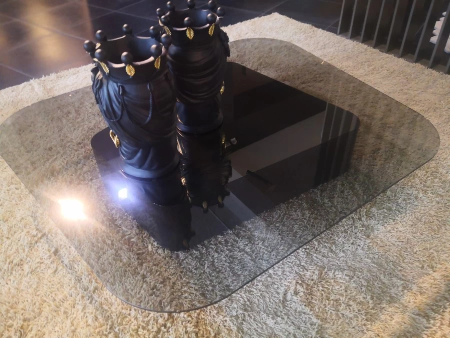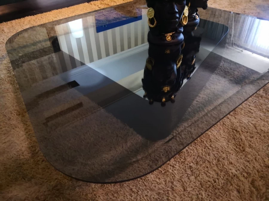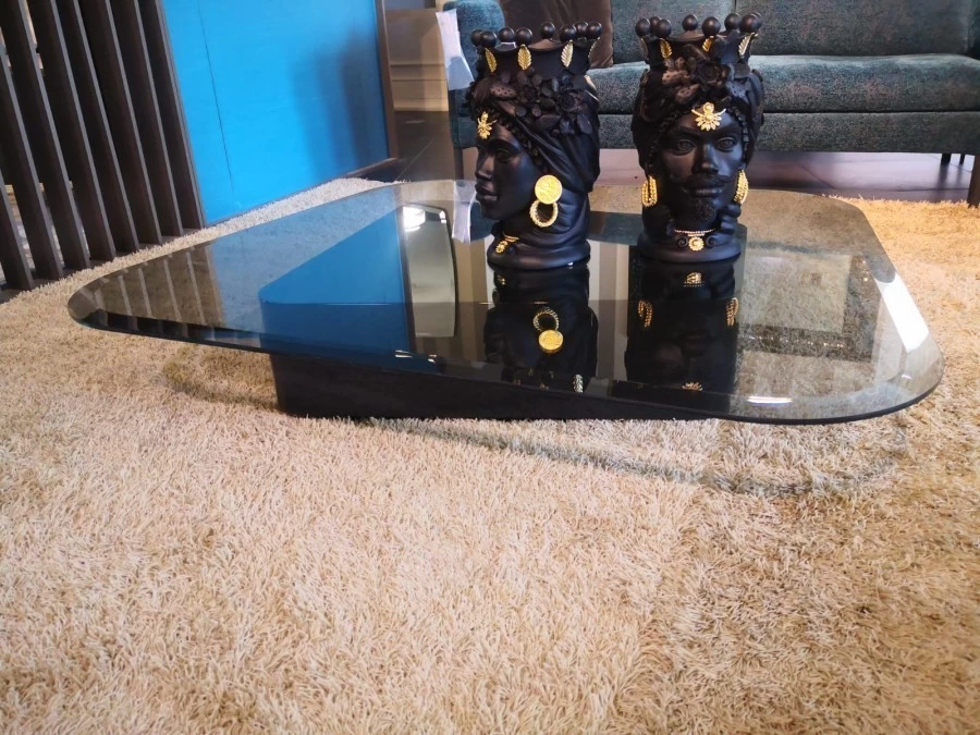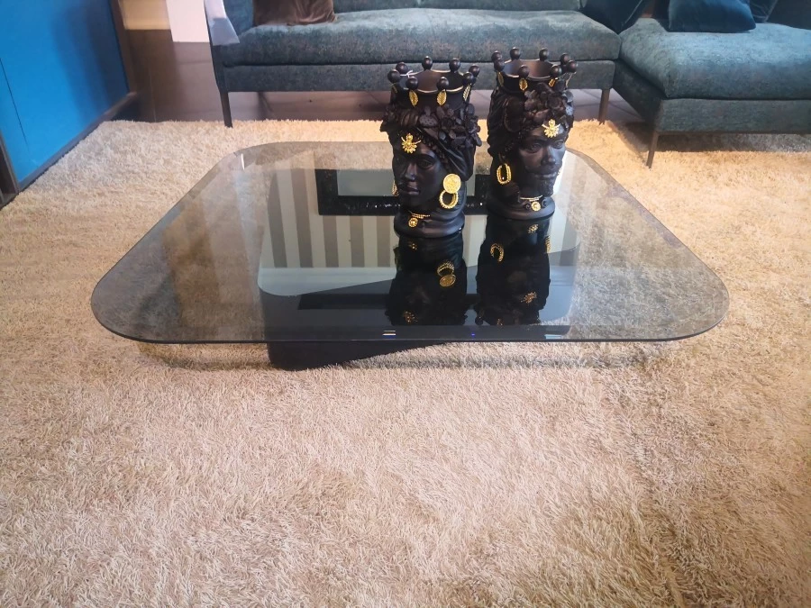 Il piano in cristallo grigio trasparente, con la sua superficie liscia e luminosa, aggiunge un tocco di leggerezza e contemporaneità al pezzo. Questo contrasto tra la base solida e il piano trasparente esprime un equilibrio perfetto tra sostanza e leggerezza, rendendo il tavolino Mayfair non solo un elemento funzionale, ma anche un’opera d’arte che arricchisce qualsiasi ambiente con il suo design distintivo e raffinato.